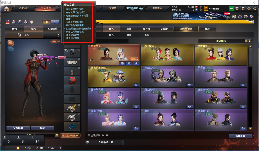 装备描述:排位:可以、、、、、、、、、、、爆破四防:幻神4皮+音效(宠儿、N9、白鲨、黄忠皮肤)、王者星神、、、、USP雷暴、COP云龙、、、、白虎、QBZ云龙、QBZ金色蔷薇、炽芒蝶刃、、、幻神音效、蔷薇音效、雷神音效、毁灭音效、黑骑士音效、、、1套雷霆、4套雷暴、1套幻灵、1套神工天巧、1套云龙、、、爆破四防(传说女帝)