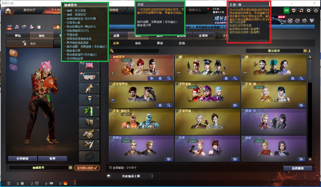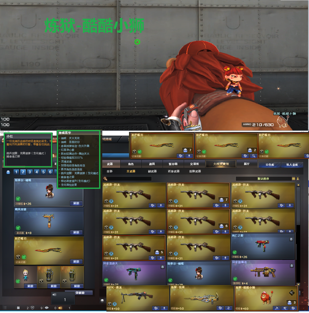 装备描述:排位:可以、、、、、、、生化四防全装(可以变更背包、看僵尸血量):无需换弹、8烈龙、盘龙、炼狱、炼狱-酷酷小狮、斯泰尔蝴蝶、异变清道夫、异变镇魔者、死亡之眼、飓风双雄、MAC-涂鸦、3把炽芒蝶刃、手斧镜、生化减速雷、超级对讲机、全部弹匣、、、、、、、、、爆破四防:幻神、神威天绫、白虎、QBZ金色蔷薇、、、白虎音效、雷神音效、、、2套雷暴、2套堕天神、3套夜魔、3套雷暴王者、、、生化四防(神威莲华、小红)爆破四防(王者春)