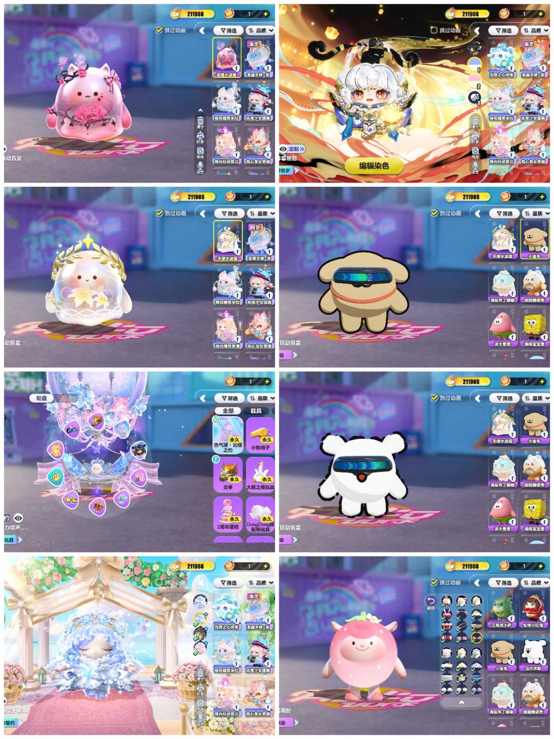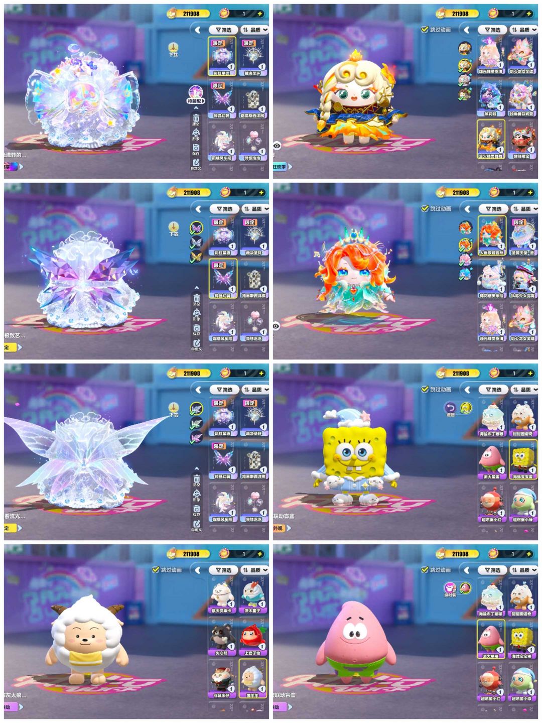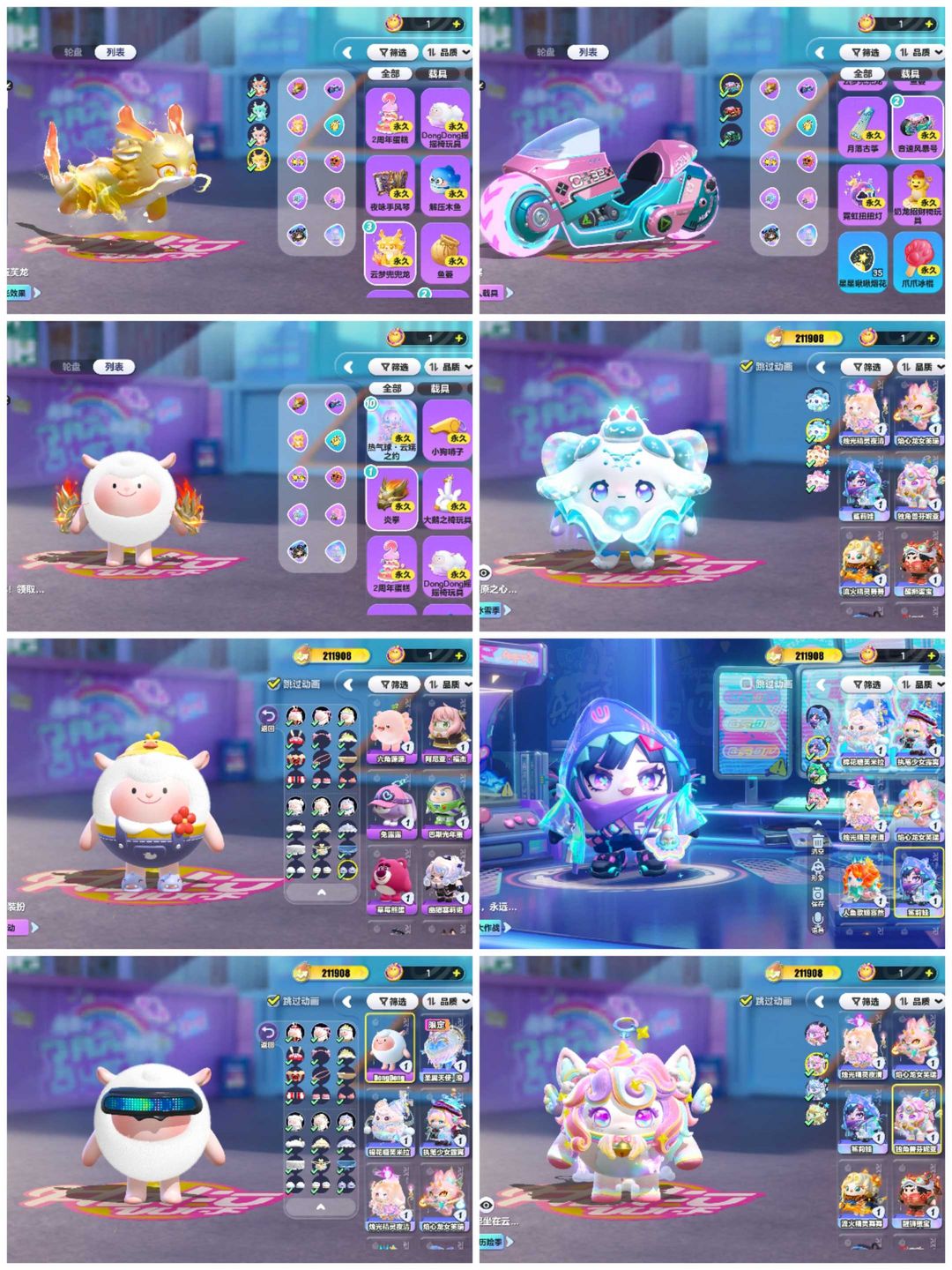 装备描述:21万潮☀彩虹星愿☀纯白誓约☀天使恶魔水波蛋☀三只小羊☀小羊衣橱全氪☀线条小狗☀黄金龙车
