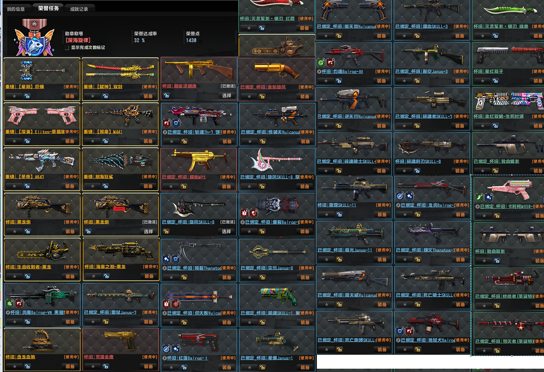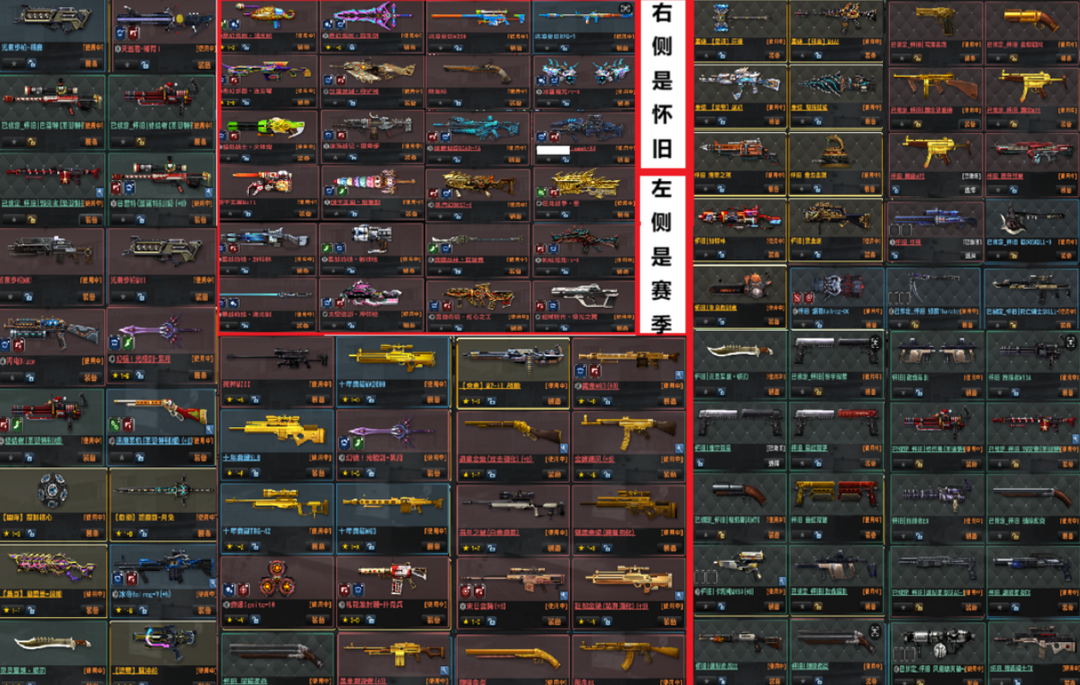 装备描述:已经去黑雾、 重铸: 弑神双剑,深渊, 邪皇,圣帝,锤子,鲨鱼 怀旧 稀有: 闪电系列: 赛季悬赏: 3-24赛季悬赏(3夏日5燧发枪6绿野7朋克8魔咒9巨龙10蒸汽11恐龙12奇幻13星战14遗迹15超械16奇境17沙漠18超能19冰海20太空21饼干) 强化怀旧武器:猎魂骑士ex,灭灵军刺,锯刃,星红双子,金红双蝎,致命双刺,破碎炙焱,爆裂炙炎ex,爆裂炙炎dx,终结者ex, 怀旧,黑龙炮,盘龙血煞,海皇之怒,生命收割者电锯,旋风斧头斧子,圣诞毁灭者,圣诞终结者,荒漠金鹰,殒裂,卡利柯+8,风魔啸天破, 合金,超兽, 原石套,圣诞套,沙尘MG3,尤利乌斯+6,玩具先锋+5,爆炎蒸汽+6, 致命打击,极速飞奔,进化基因,屠戮之刃,战神祝福,生存基因,手雷补给,圣水手雷 生化模式,怀旧模式,重铸模式,感染,赛季悬赏