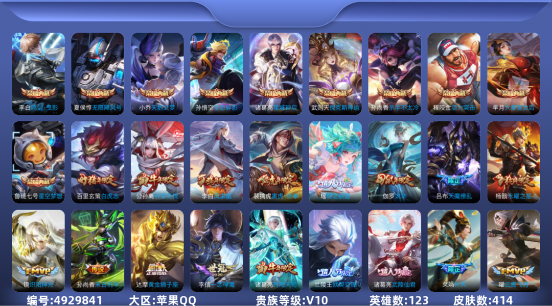 装备描述:5典藏1无双75传说 实名: 可修改 英雄数: 127 皮肤数: 518 荣耀水晶: 武则天,天鹅之梦,倪克斯神谕,无限飓风号,鸣剑·曳影,弑枪猎影 无双皮: 小乔时之魔女 传说皮: 黄金狮子座,黄金射手座,冠军飞将,云鹰飞将,绛天战甲,黄金白羊座,猫影幻舞,久胜战神,炽阳神光,一念神魔,云霓雀翎,末日机甲-孙尚香,地狱火,仲夏夜之梦,音你心动-小乔,零号·赤焰,海洋之心,地狱之眼,飞鸢探春,音你心动-周瑜,胖达荣荣,李逍遥,乞巧织情,时之恋人-刘备,游龙清影,淬星耀世,超时空战士-狄仁杰,遇见胡旋,末日机甲-孙策,花朝如约,挚爱之约,挚爱花嫁,无双飞将,音你闪耀,碎云,神器·狴犴令,山海·炽霜斩,山海·琳琅生,山海·苍雷引,炽翼辉光,燃星之曲,画中仙,浮生妄,大乔-时之奇旅,永恒水手月亮,夜礼服假面,霜月吟,澜逐花归海,艾琳觅芳踪 限定皮: 冰锋战神,遇见飞天,李小龙,奔雷神使,祈雪灵祝,游园惊梦,梁祝,云端筑梦师,时雨天司,引擎之心,龙胆,白鹤梁神女,武圣,烈魂,魔法小厨娘,辉光之辰,异界灵契,玄嵩,白晶晶,岱宗,天狼溯光者,虎魄,天魔缭乱,神威,蜜橘之夏,幽恒,奇迹圣诞,飞衡,乒