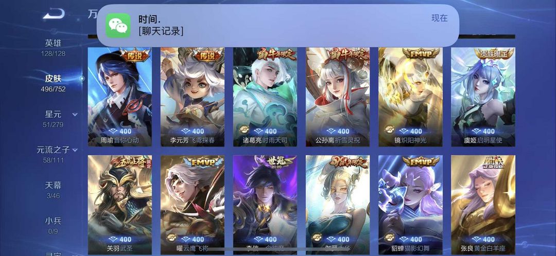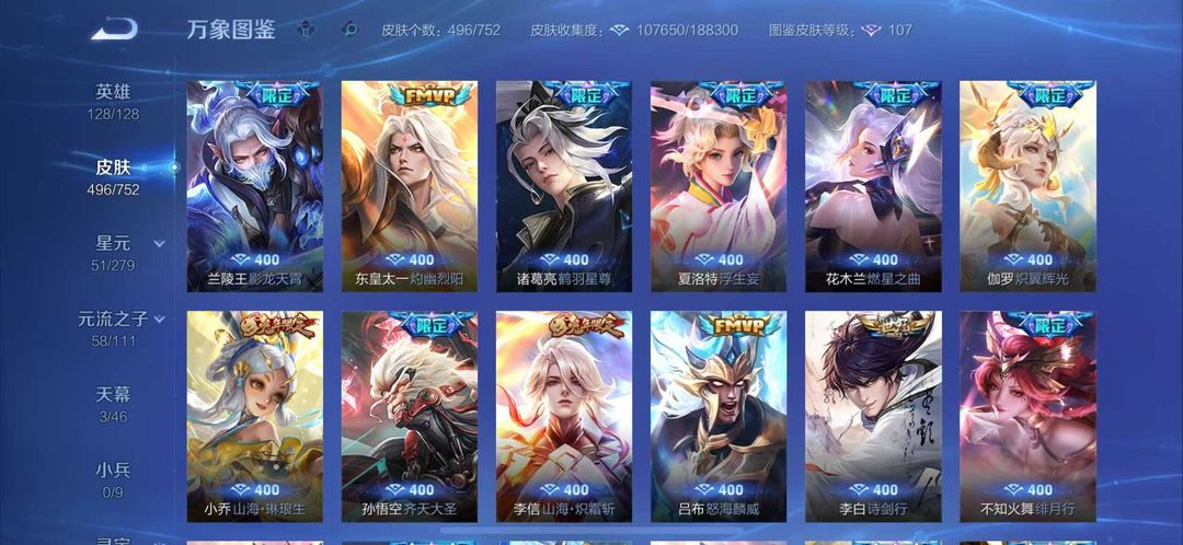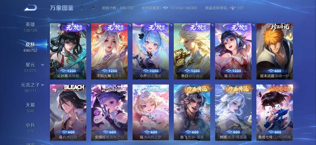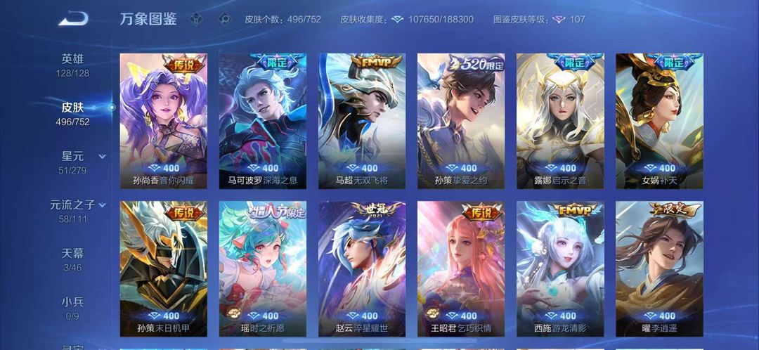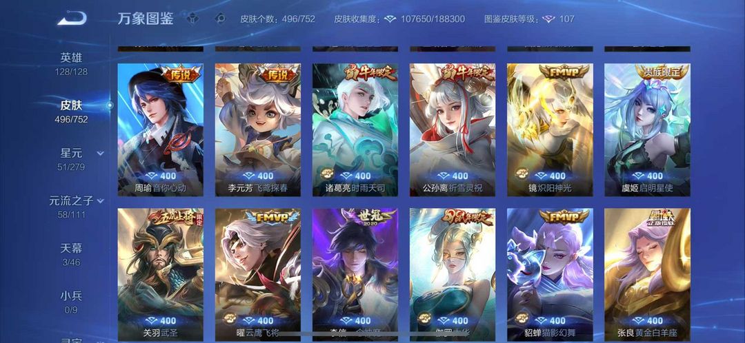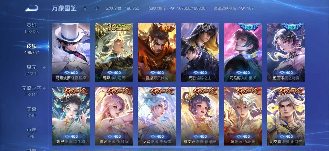 496皮肤繁花天幕貂蝉慕夏❤10无双7典藏❤猴子无相无双凯神罪天机白泽离烟恨花合斗❤8珍品70传说皮