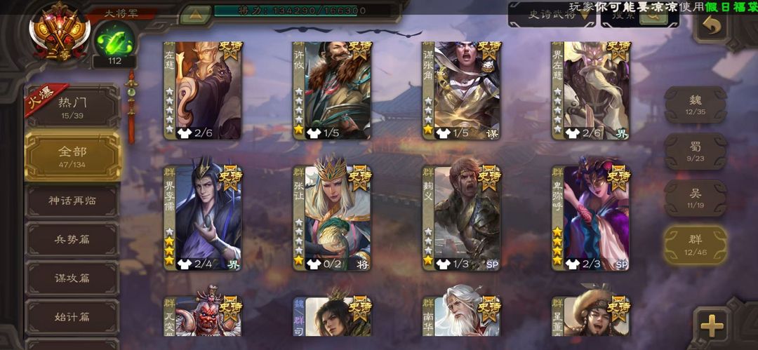 装备描述:动态戏志才☆动态星周不疑☆骆统☆动态周处☆吴景☆动态界徐盛☆许攸☆谋张角☆界左慈☆界李儒☆动态白马☆动态卑弥呼☆南华老仙☆星黄忠☆神吕布☆动态神赵云☆神陆逊☆动态神太史慈